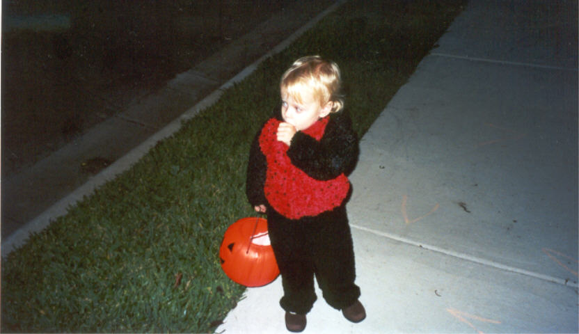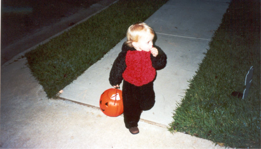 October 31st, 2002 was Abby’s first time to go Trick-or-Treating. Here’s some pictures from that momentous event. She went as a lady bug, but she wouldn’t let us keep the hood over her head where the antenna were. She was pretty shy and didn’t really understand what was going on. After a few houses she caught on that these strangers were giving her candy. She would reach into the bowl and get some candy and say her usual “welcome” instead of “thank you”.