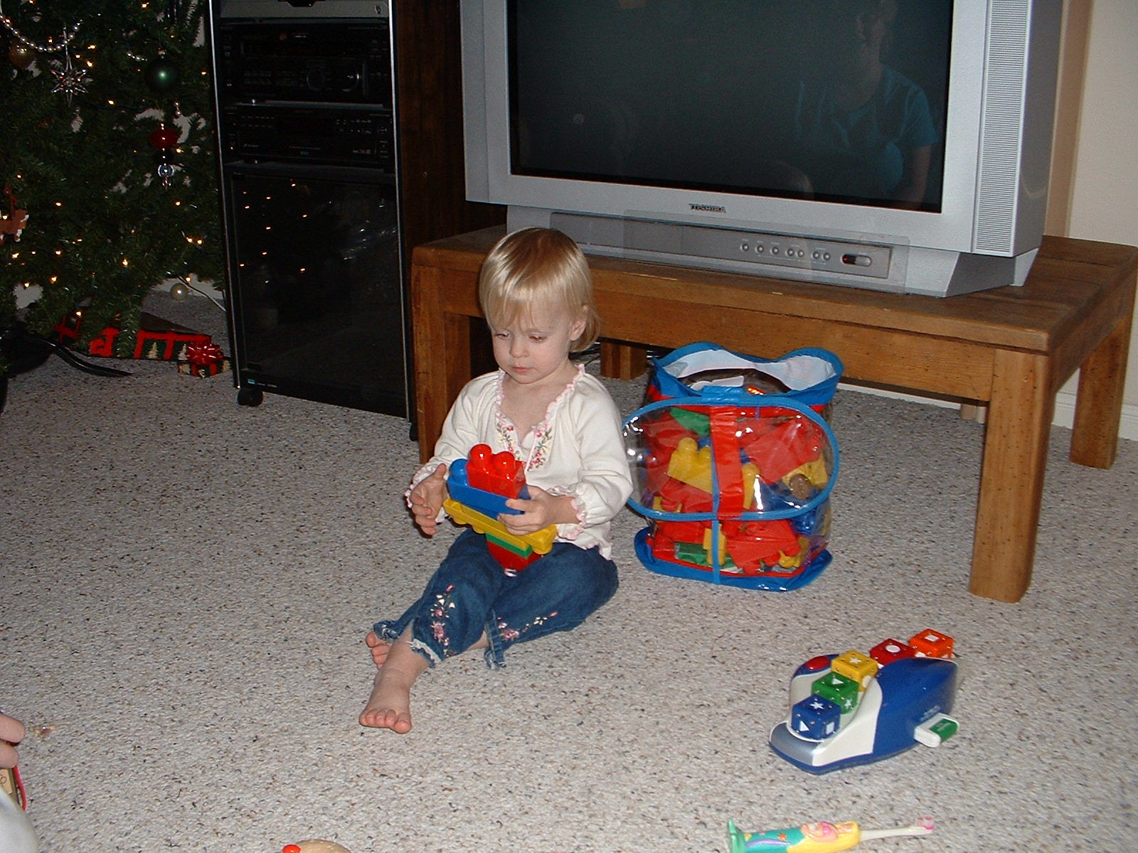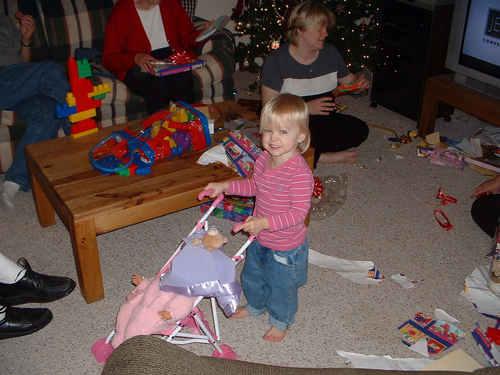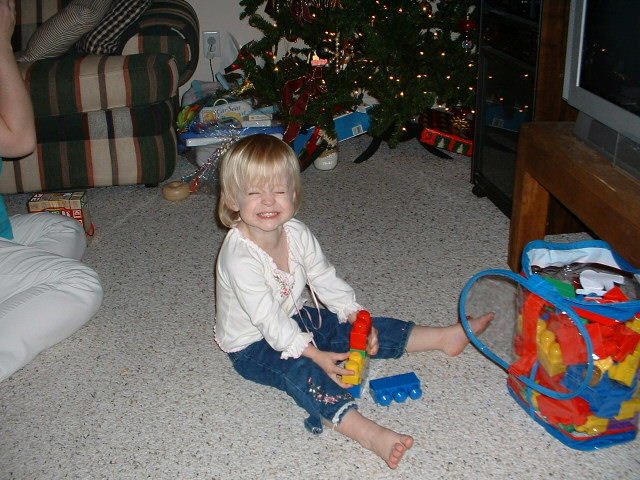 Abby opened many gifts for her first real Christmas. Here’s a few pictures from Christmas. She got into her presents early and opened one of the DVD’s that her Great Aunt Marci bought her. She was very excited about every gift she got. We had a big Christmas with everyone coming to us. We didn’t want to travel this year since the new baby was coming any day now. We had Jennifer’s parents and grand parents visit on Christmas Day and my parent visit on the weekend after Christmas. I received a digital camera as a present from Jennifer, which means that pictures will be put on the web site in a more timely manner. Thank you to everyone who sent gifts. Hope you had a merry Christmas.