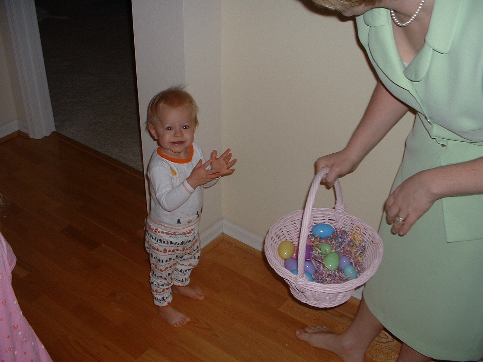 No rest for the weary. It was a late night at work, but the Easter Bunny arrived early. He brought the kids books and Abby got a craft kit. They set out collecting the eggs that the Easter Bunny had left. Emily was pretty funny, clapping each time she collected an egg. She was very proud of herself.