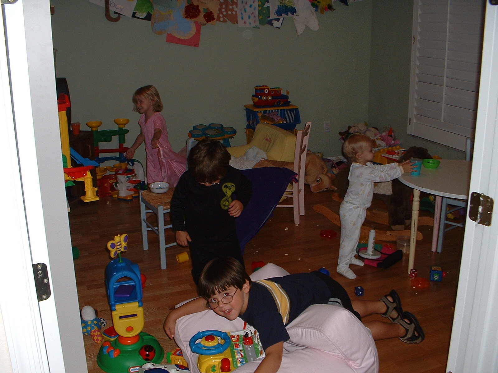 Tonight our neighbors from across the street, Lucas and Connor, came over to visit while their mom went shopping for supplies for the storm. You can see from today’s picture that it was like the hurricane arrived early to our play room.