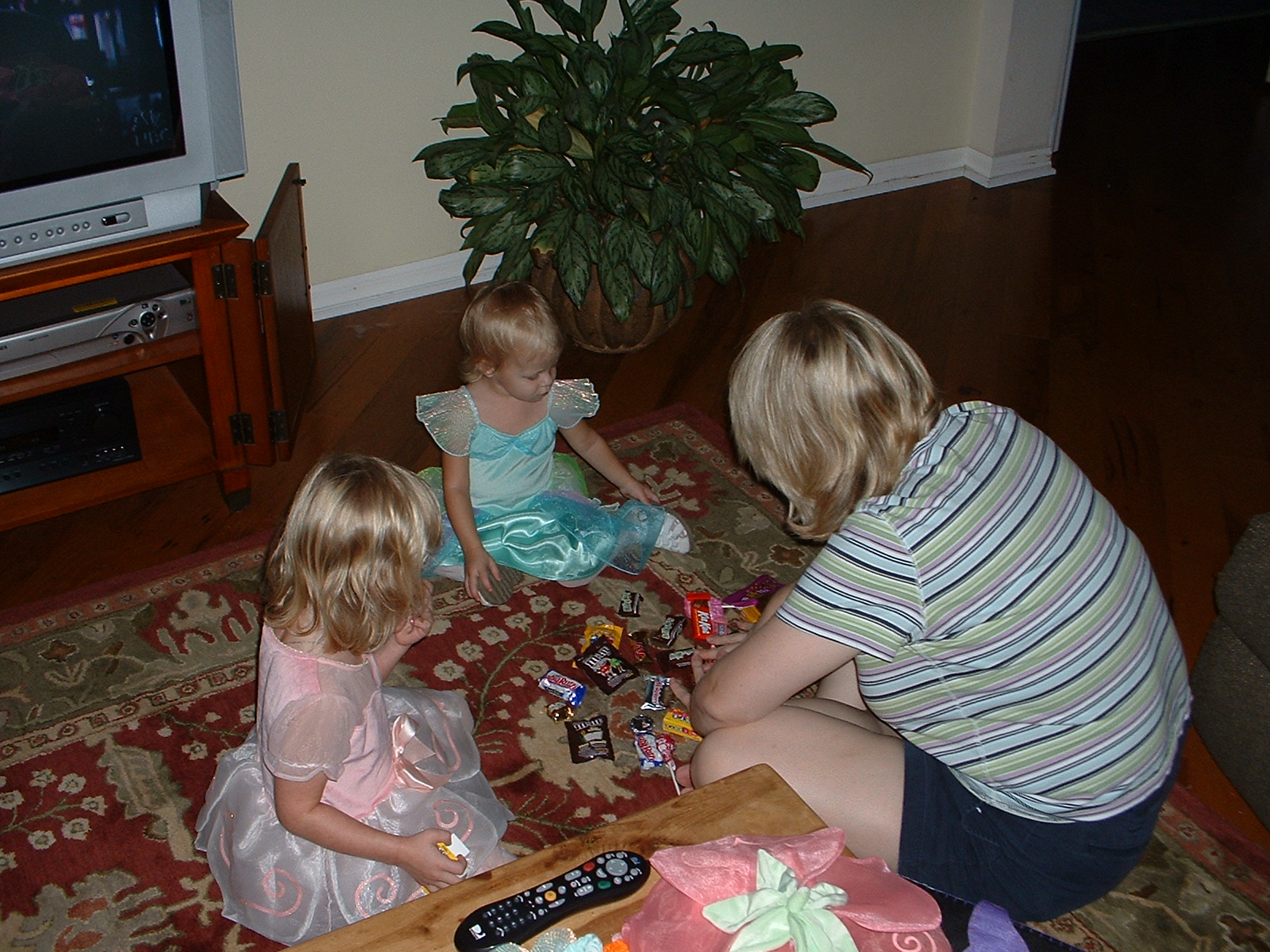 Today’s picture is another one from Halloween. Abby and Emily look over their pile of candy that they received over the night.