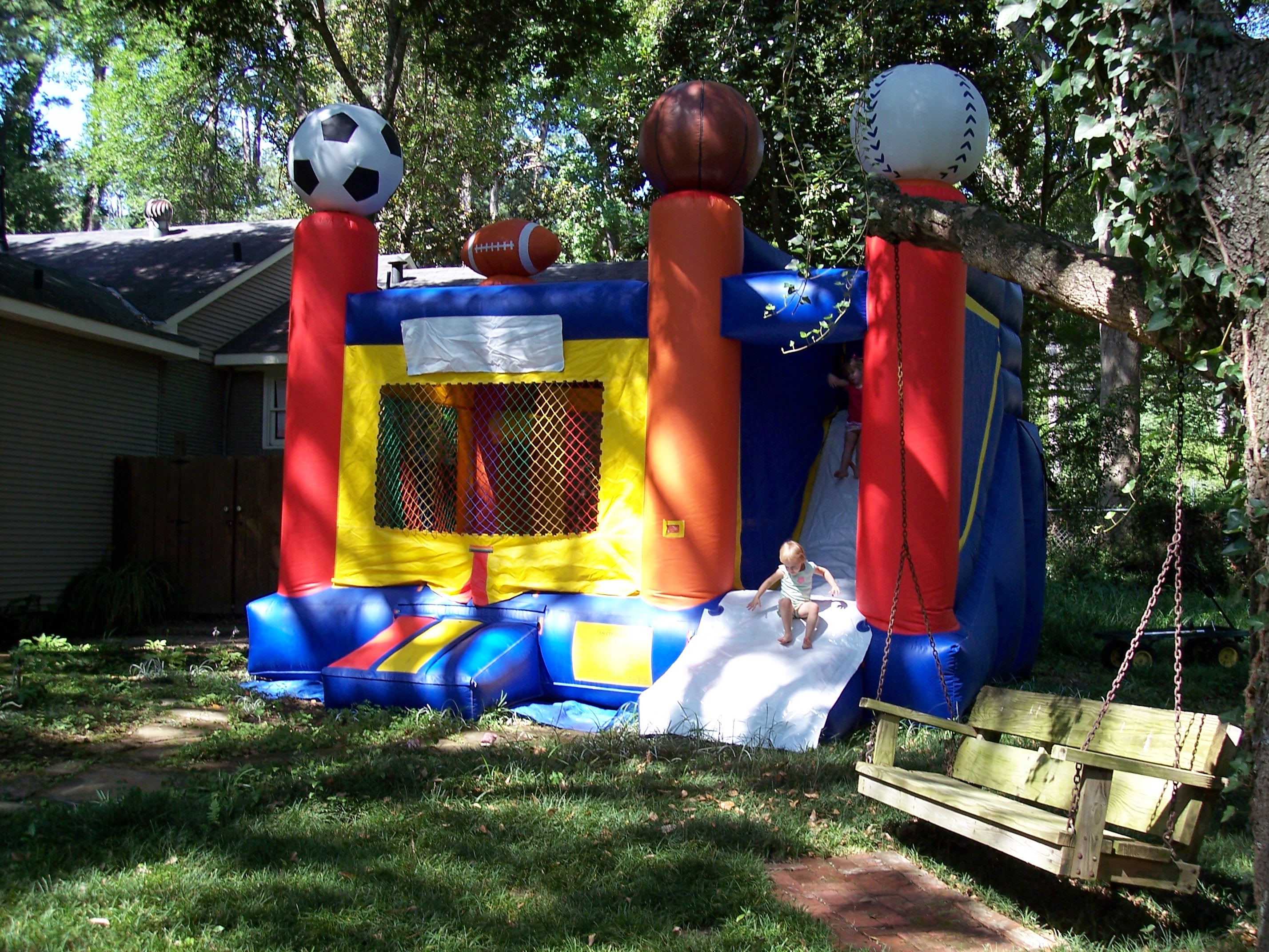 Dad and I went up to Barksdale Air Force Base, where he works, and rented a bounce house for the kids. My cousin, Paul, has three boys, two around Abby and Emily’s age, so we needed something to keep them occupied and it worked pretty well. Their Uncle Graham kept them occupied by playing with them most of the day. My parents have a nice deck and we sat back there and ate hamburgers and caught up with what everyone was doing.