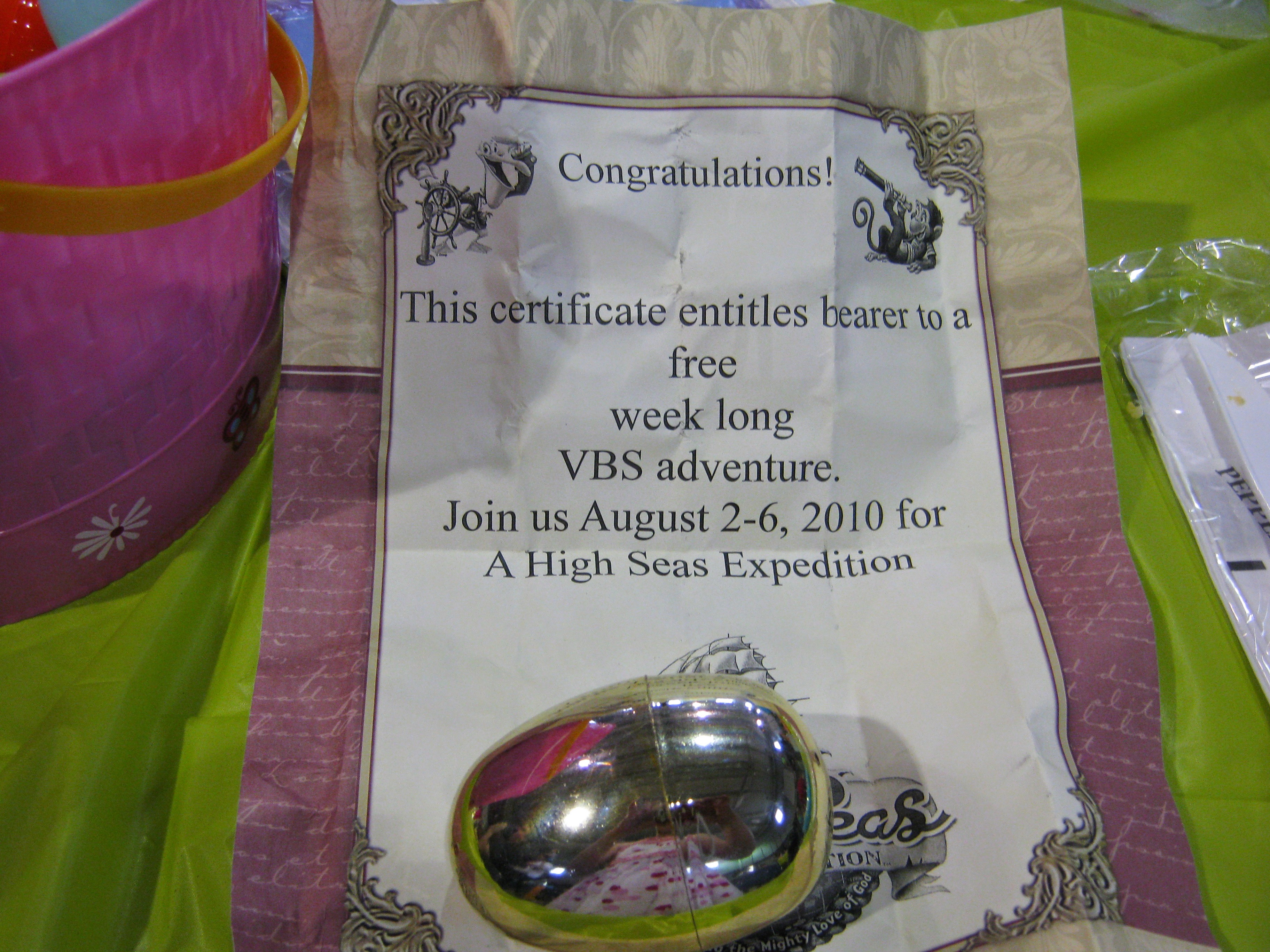 Abby’s group was the most complex. Their eggs were buried and were well hidden. Abby was rewarded by digging into a bag of sand and came up with a golden egg. The egg contained a message saying that she had received a free trip to Vacation Bible School this summer.