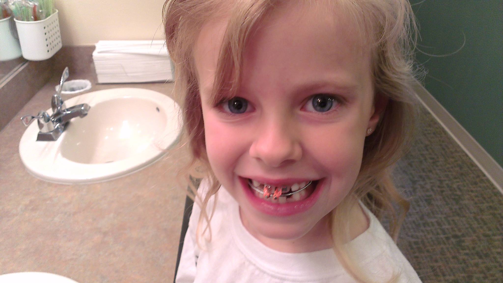 I have to say those are some crazy braces. I think the doctor put on the 1960’s braces and not the 2013 braces. He said they would be off by the end of the summer and it will correct how one tooth was going in front of her bottom teeth and one was going behind.