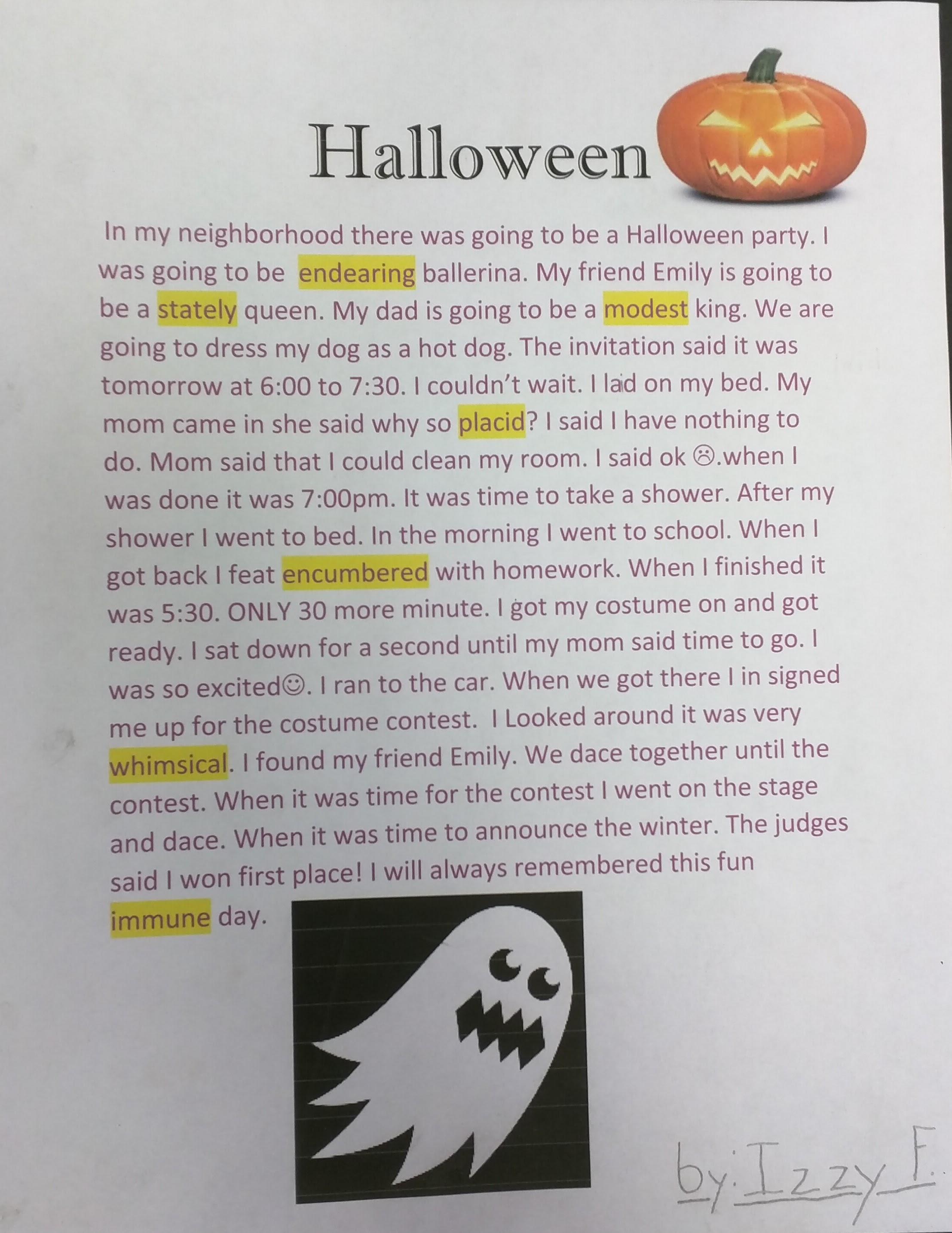 Young Author of the Month Posted on October 27, 2015 by Jason Reply This week Izzy was selected as Young Author of the Month for her story about Halloween. She was one of seven 4th graders selected for the honor.